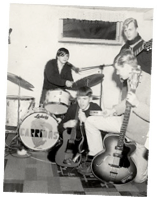 From one out of many rehearsals at Krister’s, the year is 1964 and one sees that Affas guitar is a “Höfnerplank” . Mats’ set of drums was a complete Ludwig-set with cymbals and high-hat of the mark Zildijan. On the base drum skin there is a Carrion painted by Kristers brother Björn.